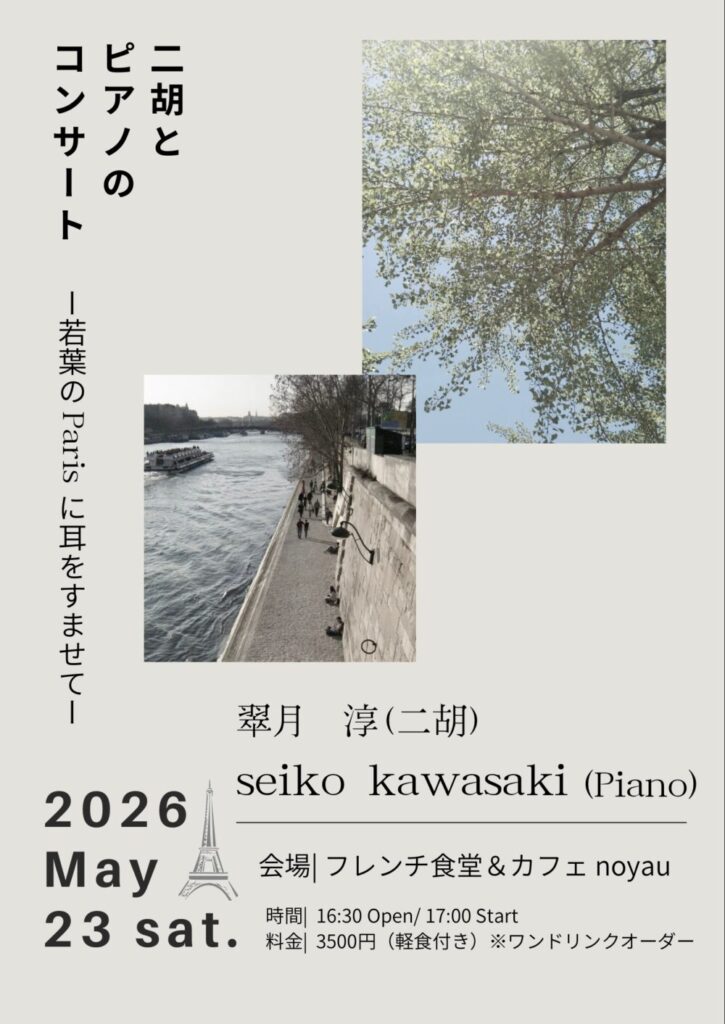 ・2026/5/23sat 森町 noyau 二胡とピアノのコンサート ~若葉のParisに耳をすませて~