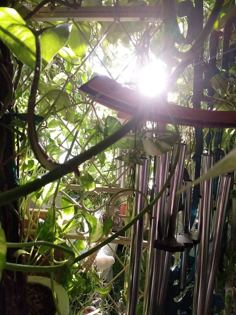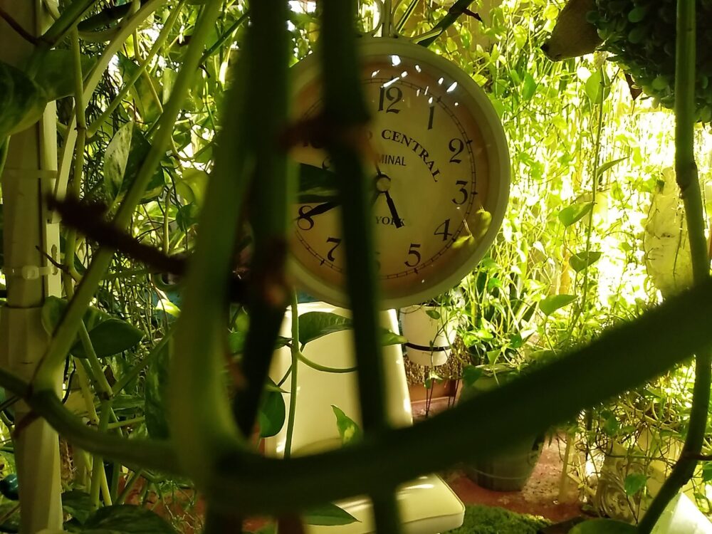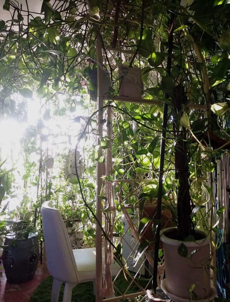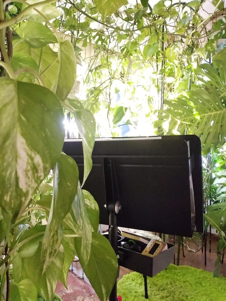 画面の左手が東、右手奥が南です。朝陽はポトスの隙間から入りますが、あまりのジャングルで窓はほとんどふさがれておりまして、日中はかなり暗いです。(本来は明るい部屋です)
