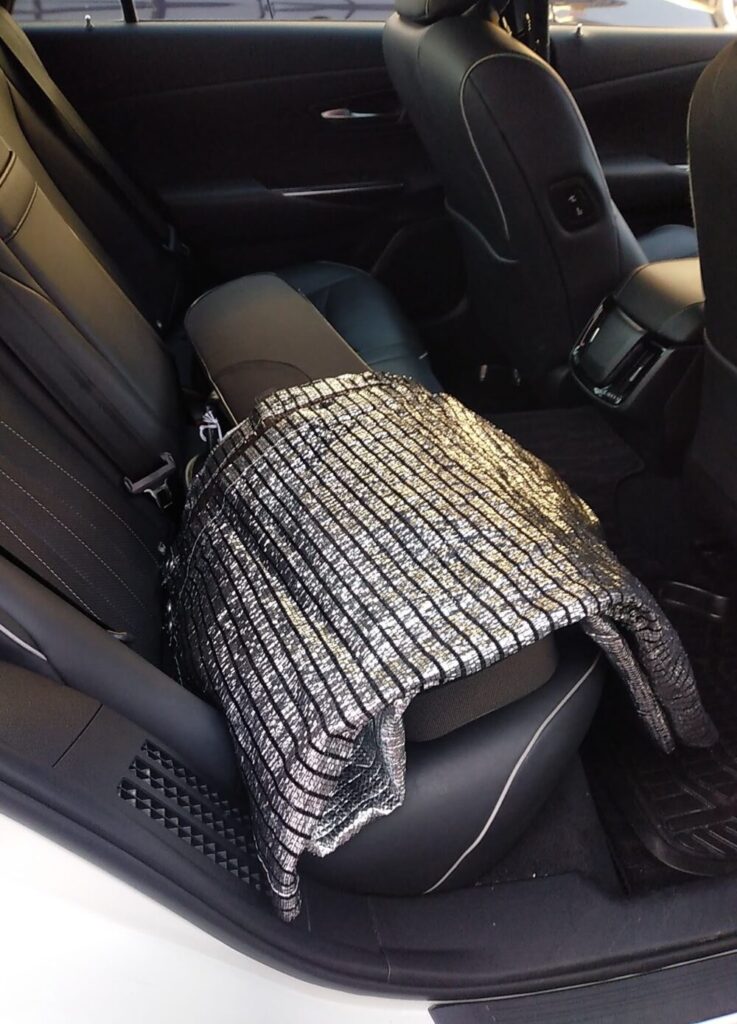 ※画像は、分かりやすく下にある二胡ケースが見えるようにしていますが、シートはすっぽり覆います。移動時間が長い場合は、(分かりにくいですが)下の画像のように2重で(2種類で)断熱シートを巻きます。